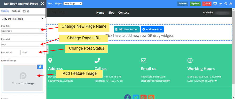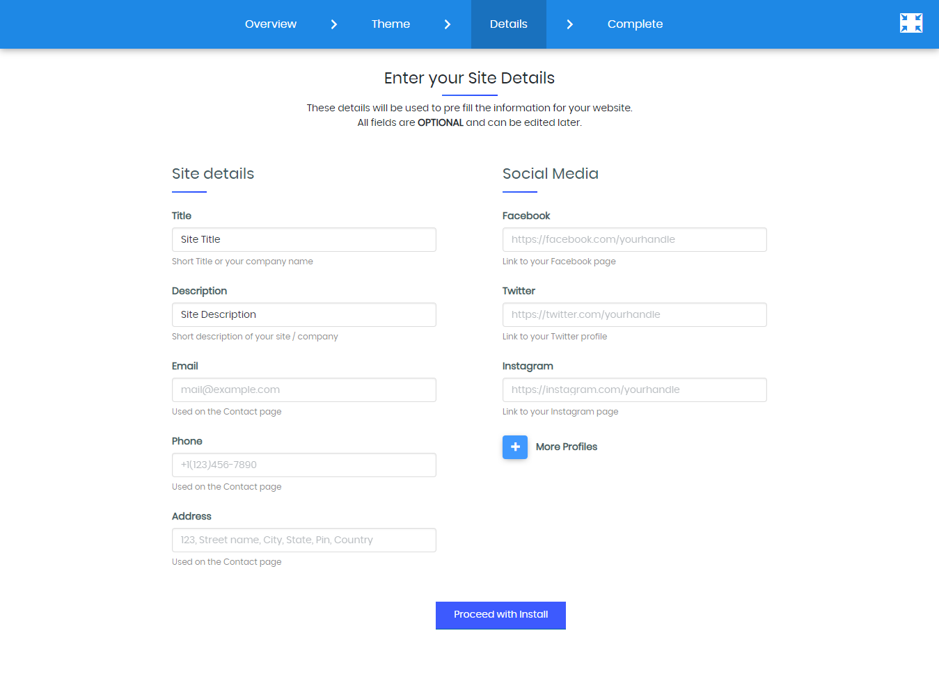1. Fill in your site details – this includes your website title, social media links, and contact information.