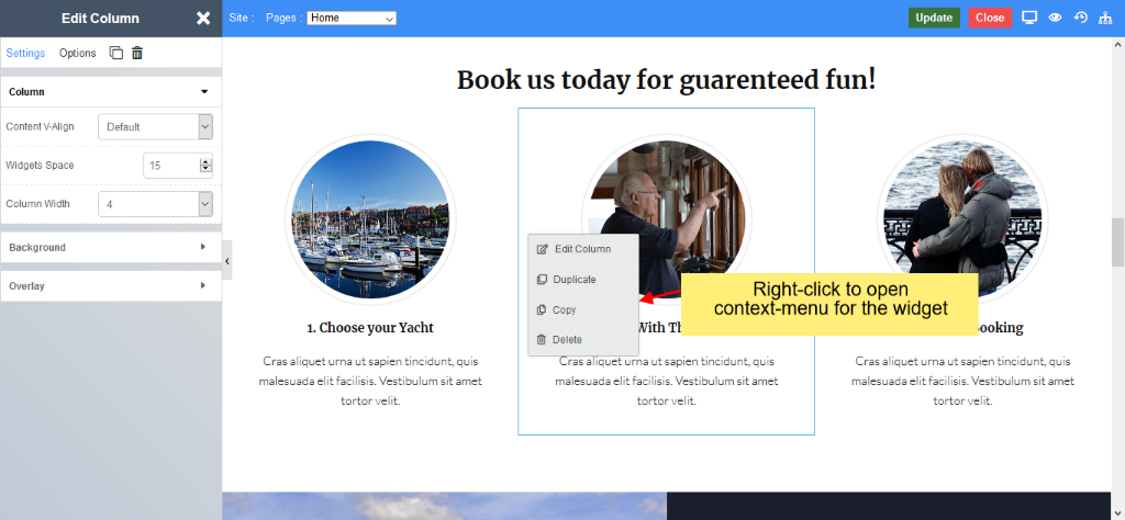 2. Right-click a widget to see options like Edit, Duplicate, Copy, or Delete.