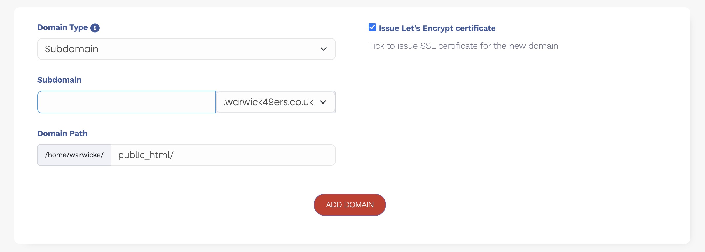 - The Domain Path field is not required for subdomains and can be left at its default value.
